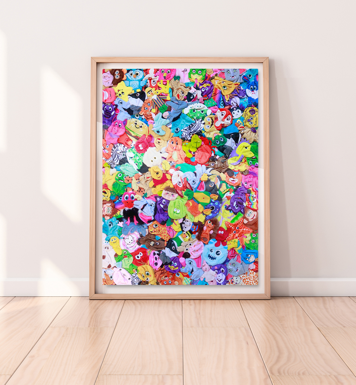 Approximately 150 small, previously loved plush toys, carefully and cozily arranged on 800 g museum cardboard. Each piece tells a story, creating warmth and nostalgia.