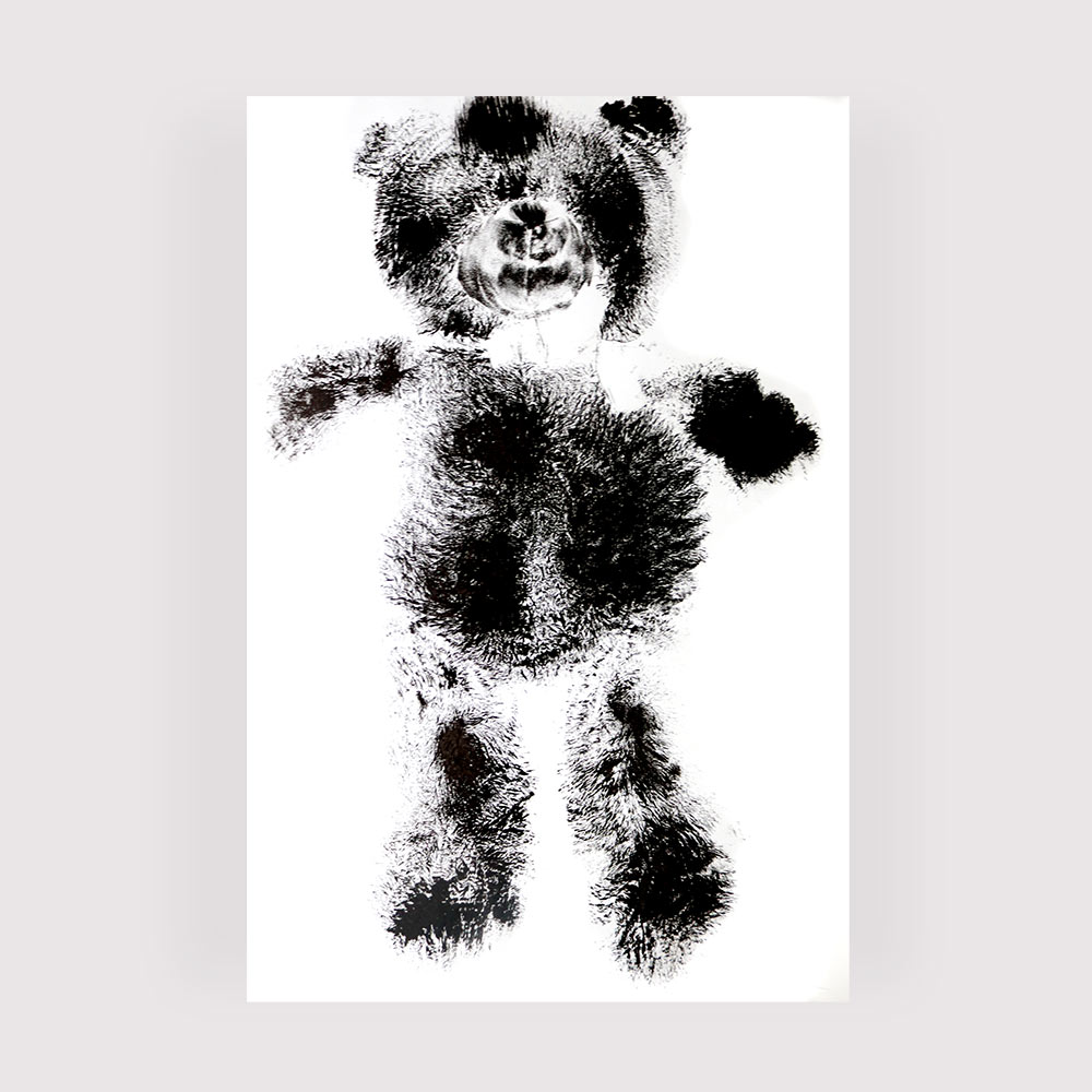 A discarded teddybear was dipped in ink, pushed on museumpaper and left his mark forever.