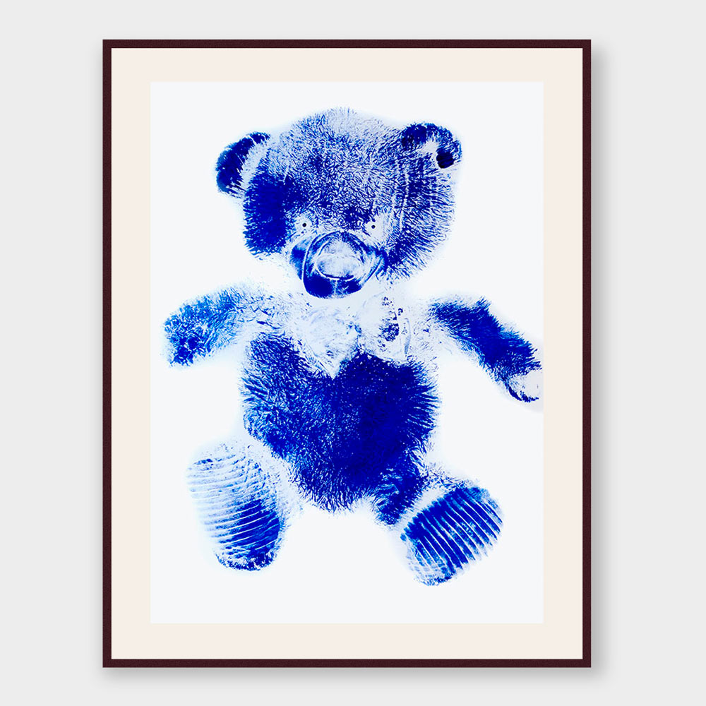 A discarded teddybear was dipped in Ultramarine blue-ink, pushed on museumpaper and left his mark forever.