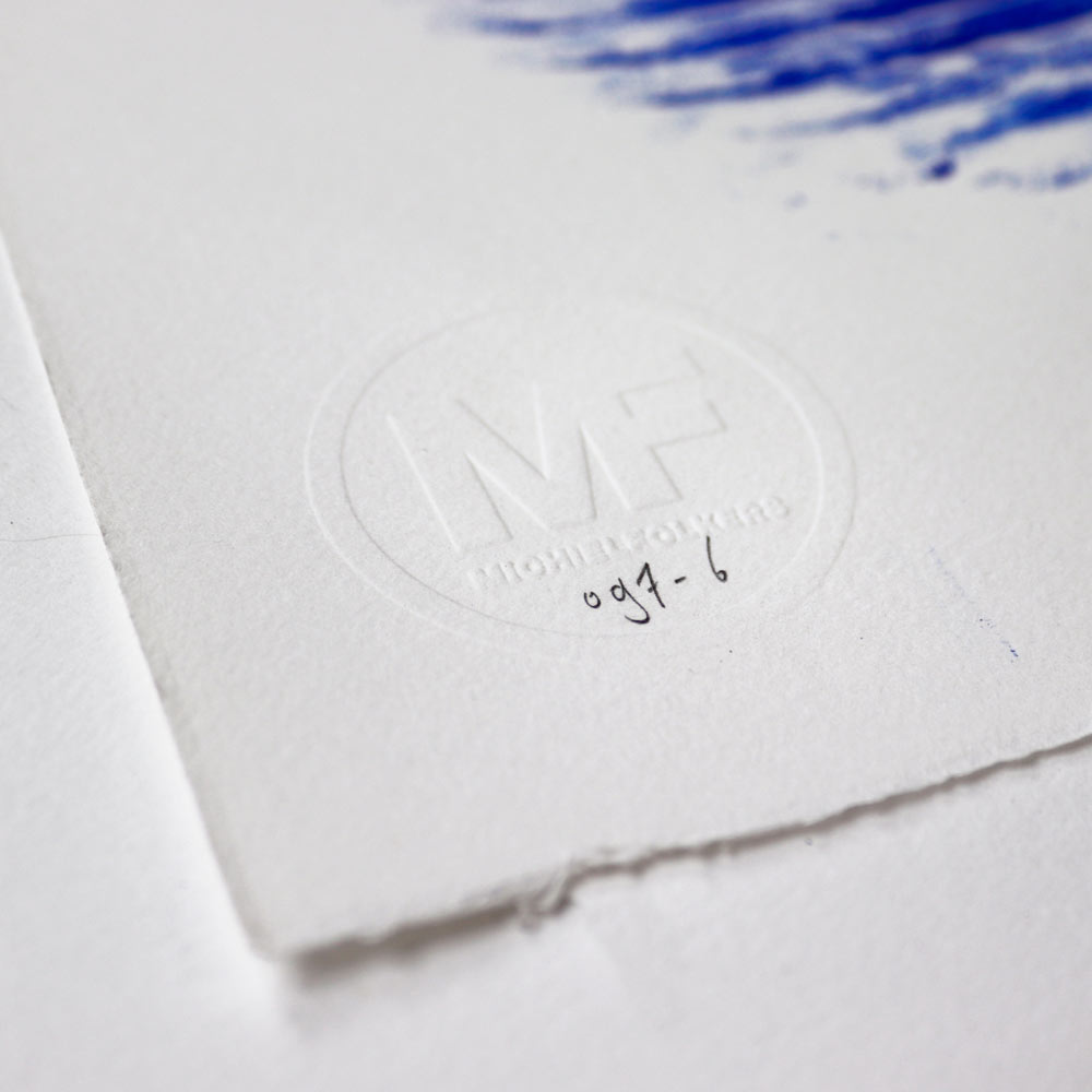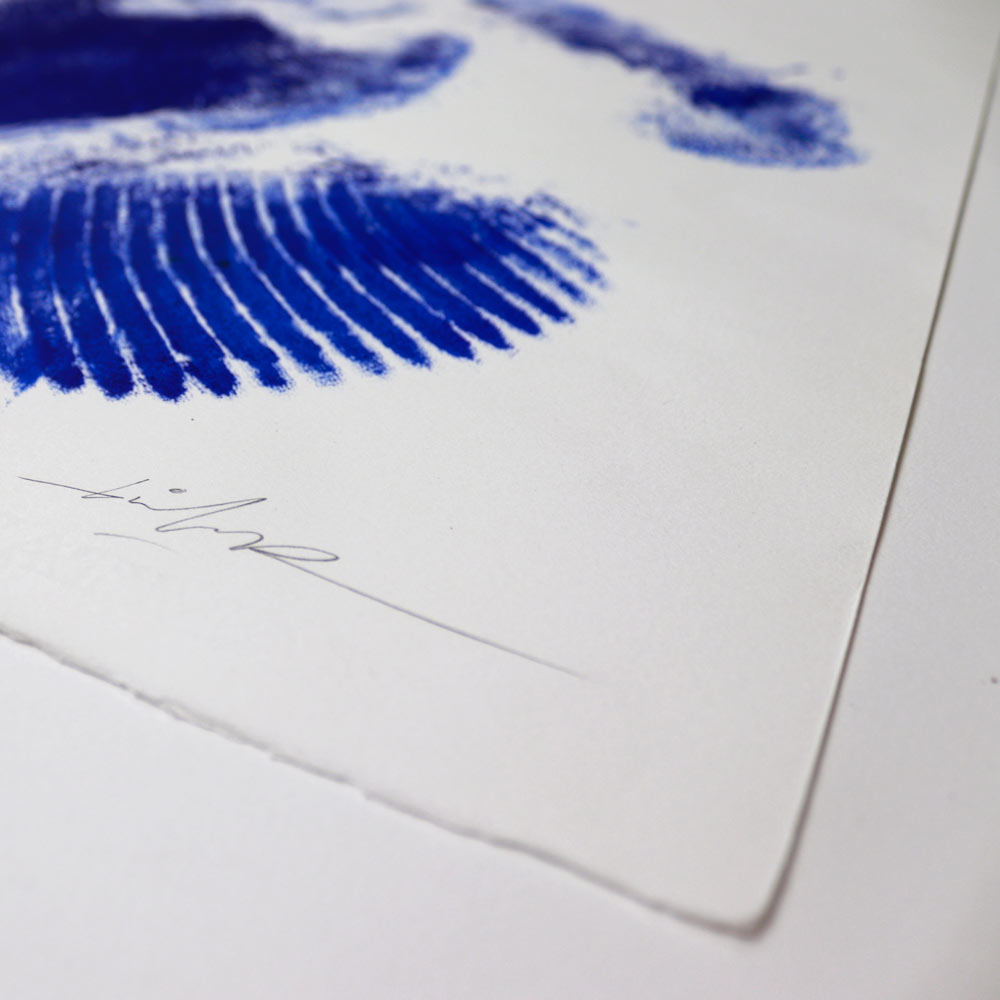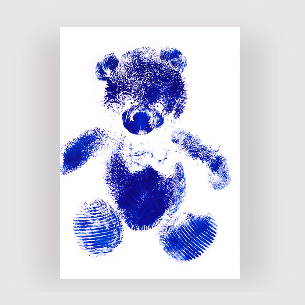 A discarded teddybear was dipped in Ultramarine blue-ink, pushed on museumpaper and left his mark forever.