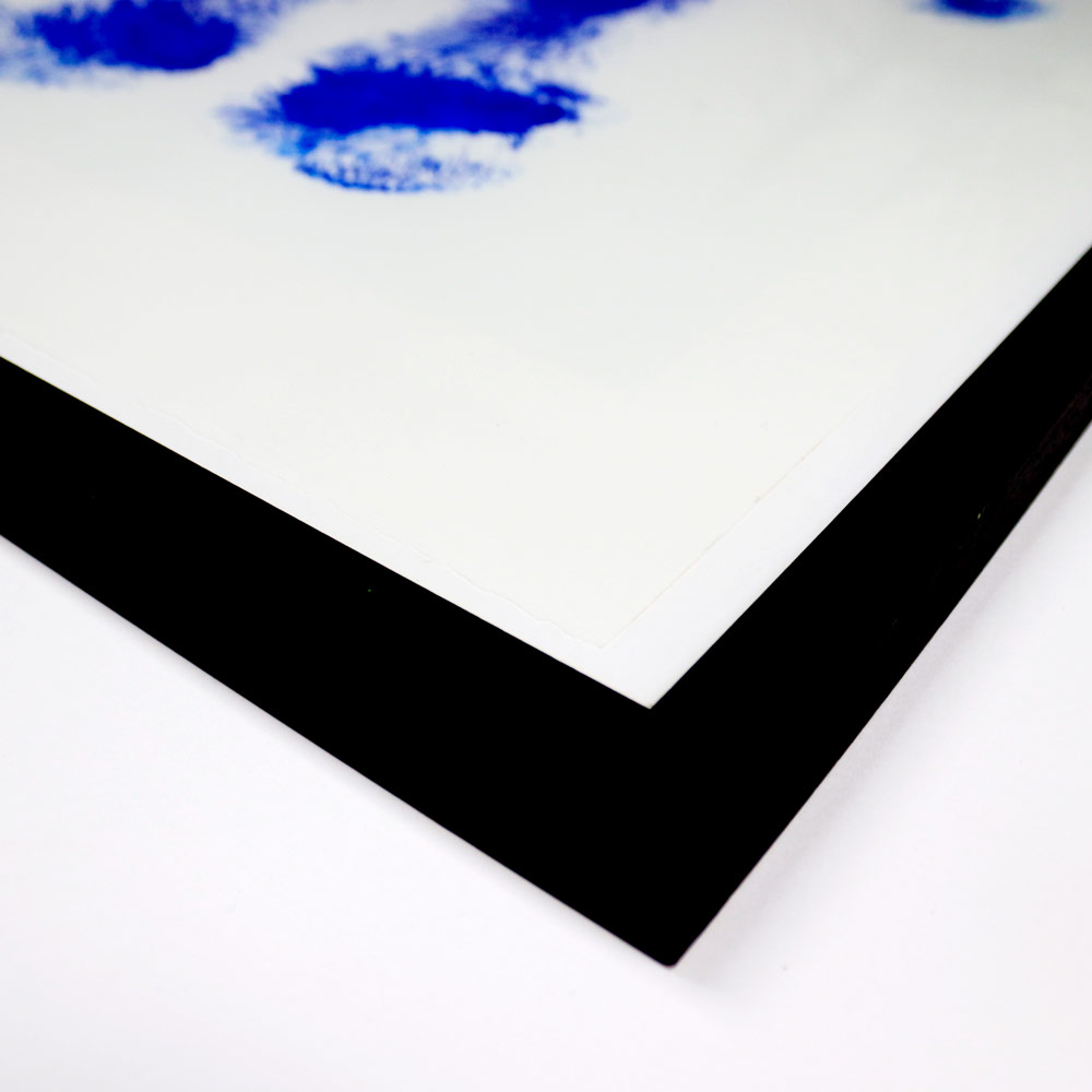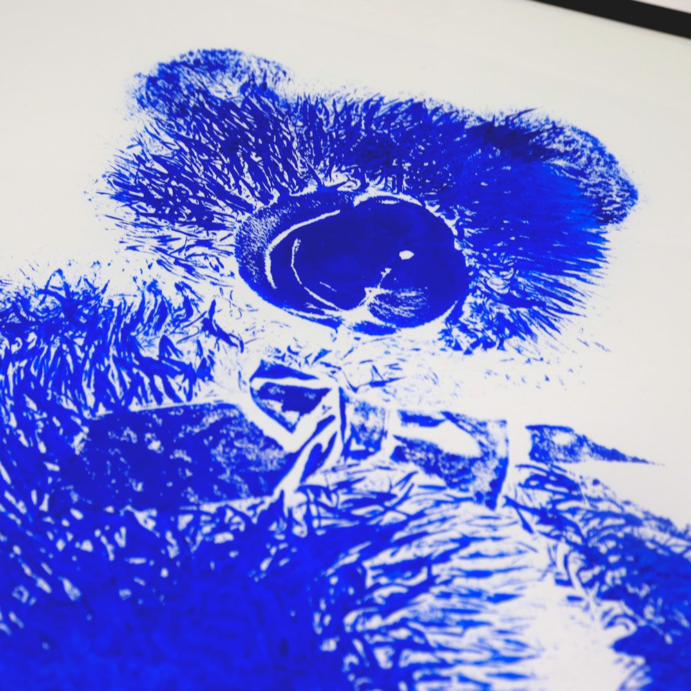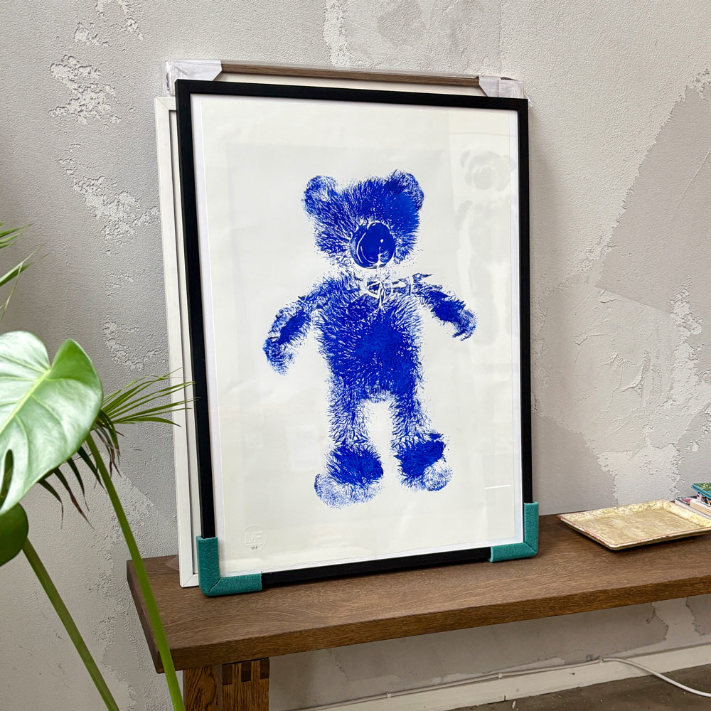 A discarded teddybear was dipped in Ultramarine blue-ink, pushed on museumpaper and left his mark forever.