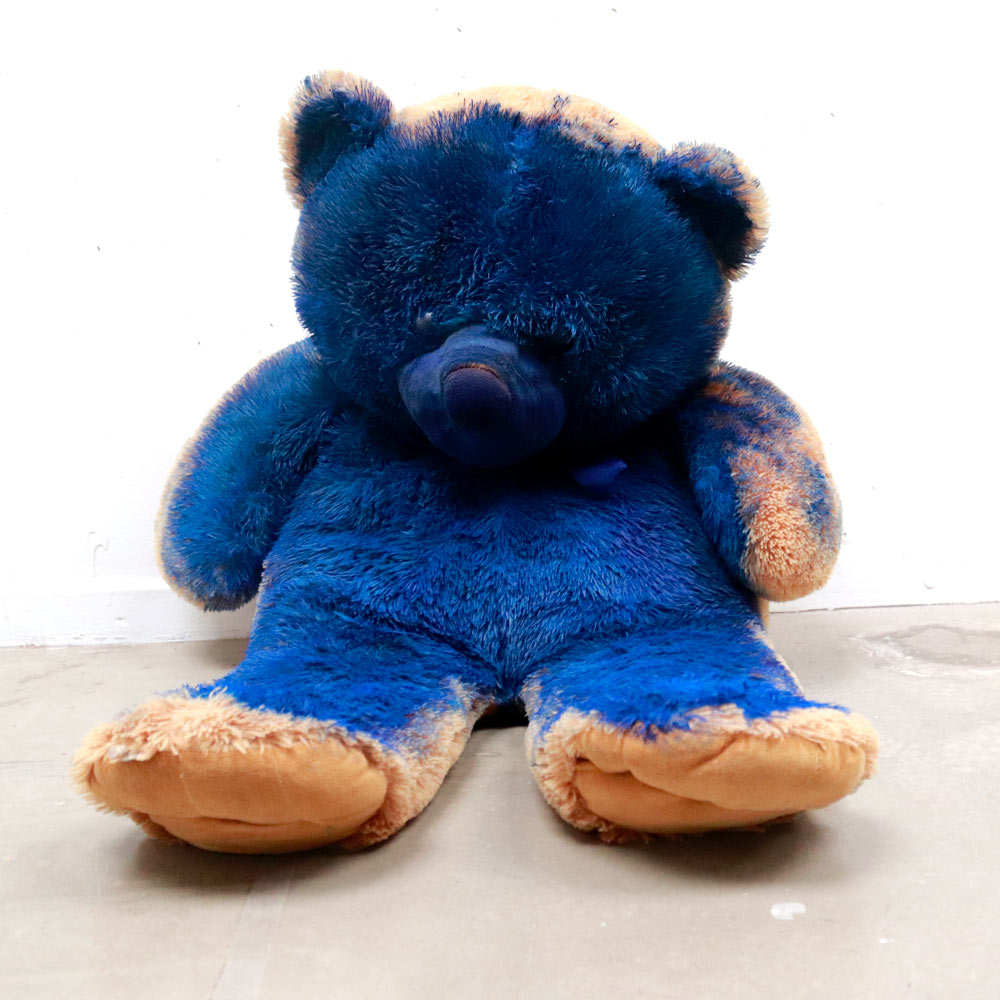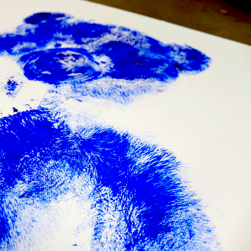 A discarded teddybear was dipped in Ultramarine blue-ink, pushed on museumpaper and left his mark forever.
