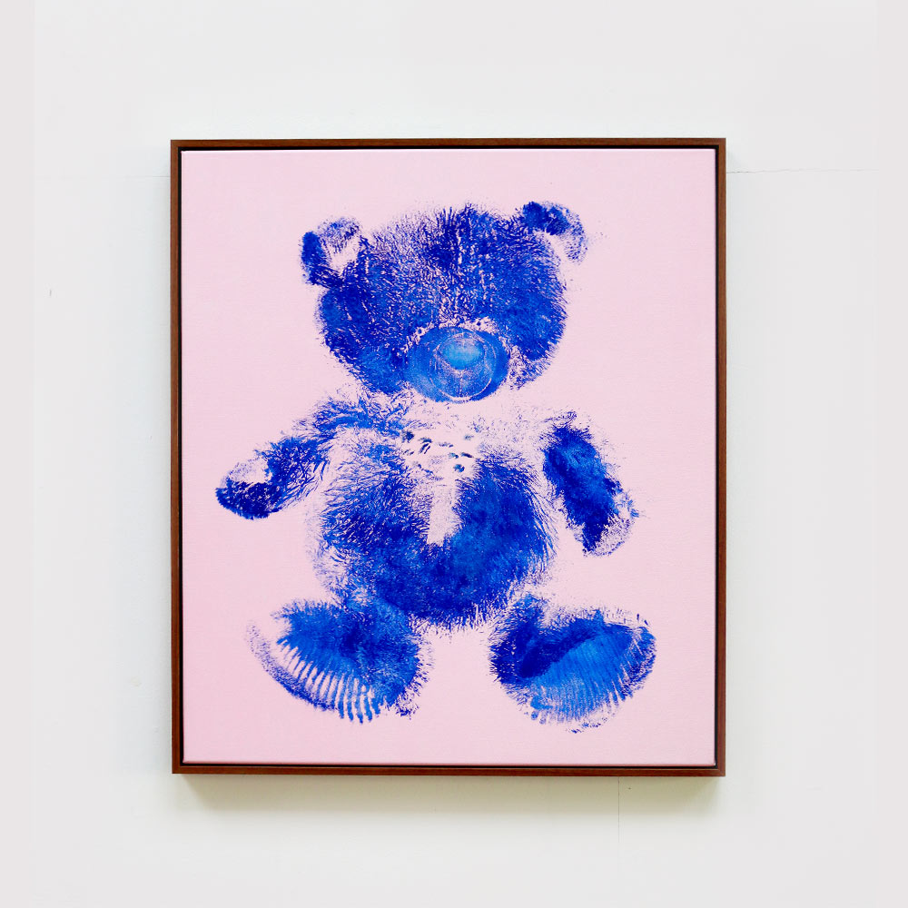 A discarded teddybear was dipped in ultramarine blue-ink, pushed on museumpaper and left his mark forever.